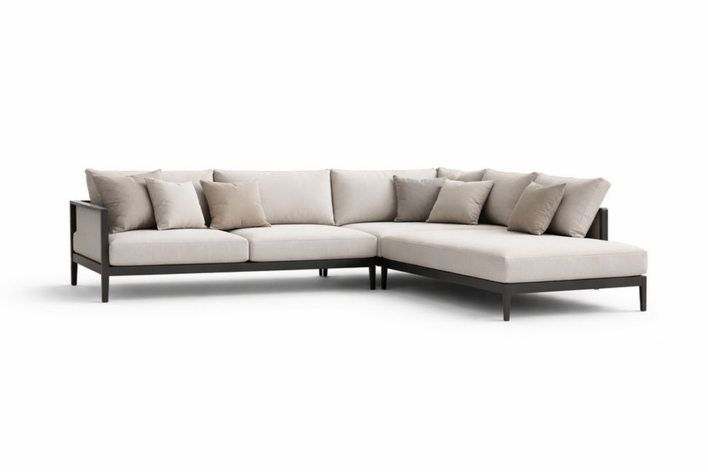Canapé d'angle en tissu beige avec cadre aluminium