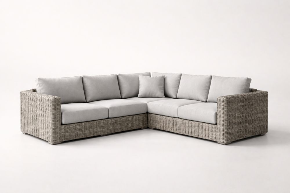 Canapé d'angle en résine tressée avec coussins en polyester