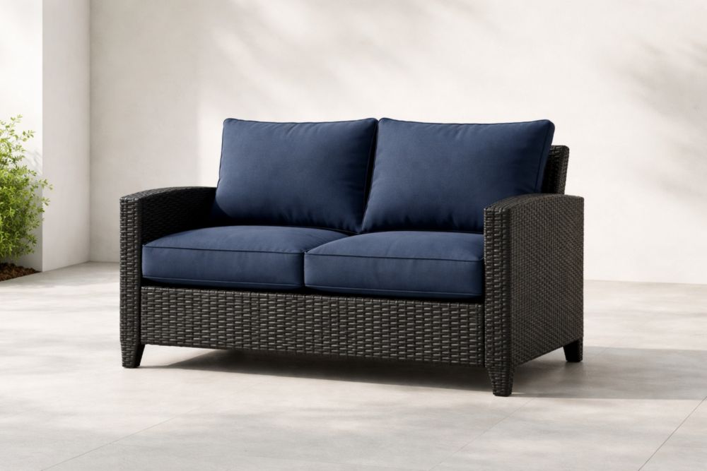 Canapé d'extérieur en rotin PE 2 places avec coussins en polyester Bleu