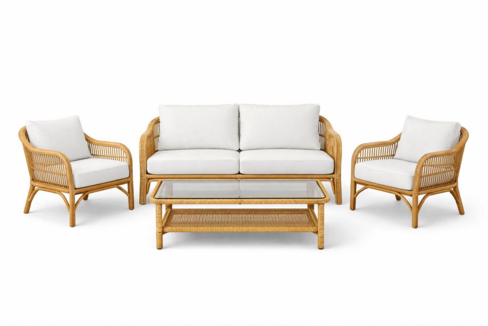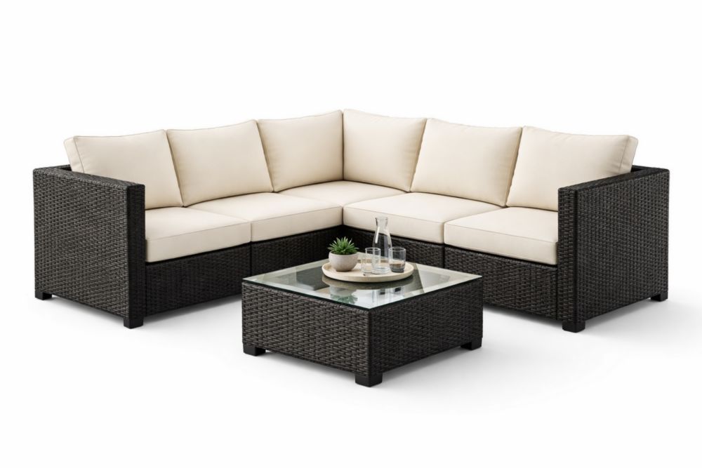 Ensemble de salon de jardin en résine tressée avec coussins en tissu beige et table en verre trempé